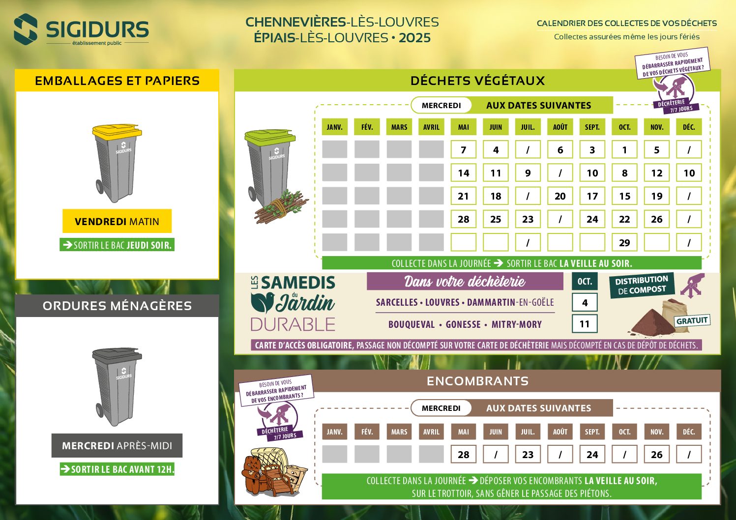 CALENDRIER DES COLLECTES DE VOS DÉCHETS 2025 CALENDRIER DE COLLECTE SIGIDURS 2025 Numéro Sigidurs: 0 800 735 736 Plus d’infos : https://www.sigidurs.fr/